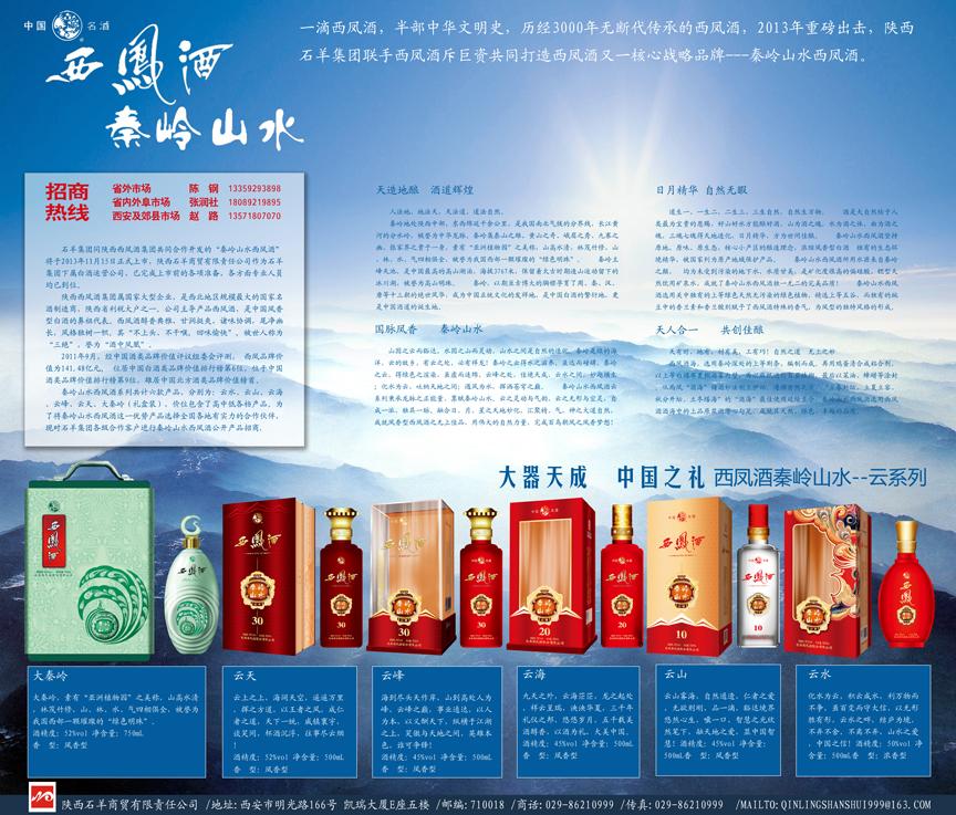 秦嶺山水西鳳酒系列共計(jì)六款產(chǎn)品,分別為:云水、云山、云海、云峰、云天、大秦嶺(禮盒裝),價(jià)位包含了高中低各檔產(chǎn)品。為了將秦嶺山水西鳳酒這一優(yōu)勢產(chǎn)品選擇全國各地有實(shí)力的合作伙伴,現(xiàn)對石羊集團(tuán)各級合作客戶進(jìn)行秦嶺山水西鳳酒公開產(chǎn)品招商,各地有合作意向客戶可聯(lián)系石羊商貿(mào)公司以下相關(guān)人員。