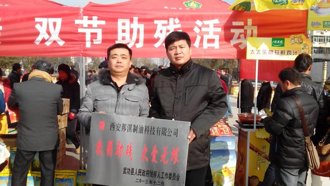 為表達(dá)石羊“邦淇人”對(duì)武功2.8萬(wàn)殘疾人的關(guān)愛(ài)之情,元月1日到3日,邦淇小包總公司聯(lián)合武功縣殘疾人聯(lián)合會(huì)、陜通配送中心在縣中心廣場(chǎng)聯(lián)合舉辦“扶弱助殘獻(xiàn)愛(ài)心、饋贈(zèng)武功眾鄉(xiāng)親”活動(dòng),此次活動(dòng)得到了油脂事業(yè)部王曉勇副總經(jīng)理的大力支持,公司提供邦淇1.8L一豆300余桶、價(jià)值5000元,現(xiàn)場(chǎng)給重度殘疾人代表免費(fèi)發(fā)放。武功殘聯(lián)理事長(zhǎng)秦喜、邦淇小包西區(qū)總經(jīng)理張帆、陜通配送中心經(jīng)理何凱及市場(chǎng)部有關(guān)人員共同參加。張總代表公司發(fā)表了熱情洋溢致辭,他首先感謝武功父老長(zhǎng)期對(duì)“邦淇”的支持,然后簡(jiǎn)要介紹了集團(tuán)及油脂產(chǎn)業(yè)的基本情況,最后表達(dá)了對(duì)武功殘疾人朋友的深切關(guān)愛(ài),博得了現(xiàn)場(chǎng)群眾的由衷稱贊。在熱烈的掌聲中,殘聯(lián)領(lǐng)導(dǎo)將一面寫(xiě)有“扶弱助殘、大愛(ài)無(wú)垠”的銅牌授予邦淇公司。