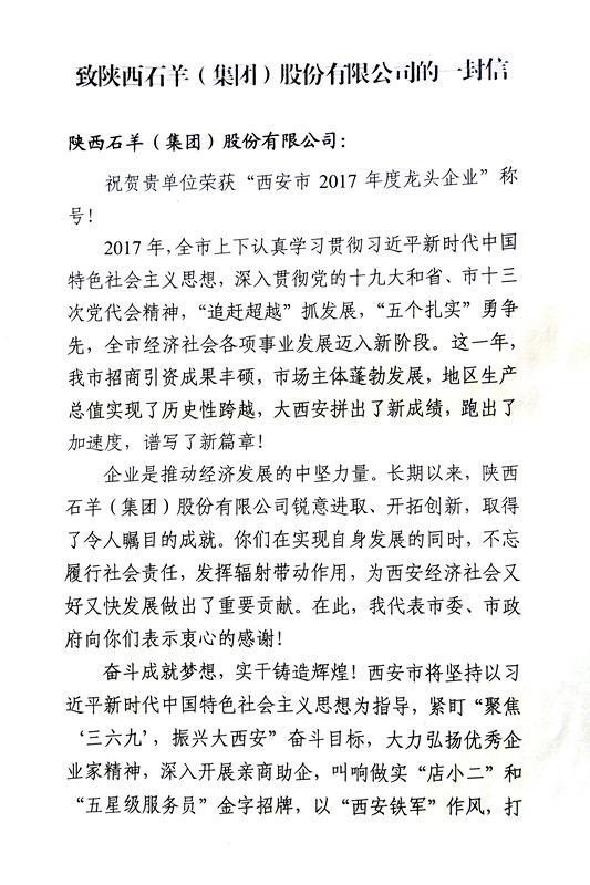2018年10月10日上午,西安市農(nóng)業(yè)林業(yè)委員會組織召開了“西安市農(nóng)業(yè)龍頭企業(yè)50強(qiáng)授牌儀式暨龍頭企業(yè)負(fù)責(zé)人培訓(xùn)會”。會上市農(nóng)委傳達(dá)了西安市委書記王永康表彰農(nóng)業(yè)龍頭企業(yè)50強(qiáng)的批示精神,為西安市農(nóng)業(yè)龍企業(yè)50強(qiáng)進(jìn)行了授牌,并宣讀了王永康書記致石羊集團(tuán)的一封信。
