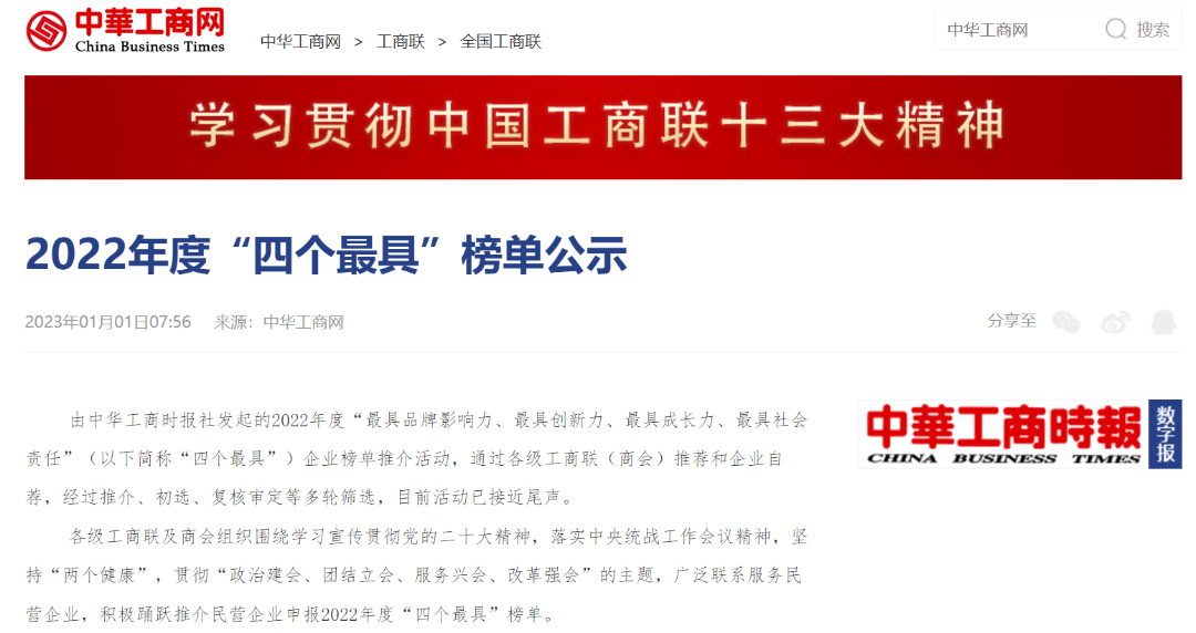 評(píng)選榜單經(jīng)各地方工商聯(lián)、商會(huì)推薦和企業(yè)自薦,中華工商時(shí)報(bào)社“四個(gè)最具”推選委員會(huì)辦公室初選以及推選委員會(huì)復(fù)核審定產(chǎn)生。“2022最具社會(huì)責(zé)任企業(yè)”榜單從抗擊疫情、抗洪救災(zāi)、參與“萬企幫萬村”等方面進(jìn)行認(rèn)定。