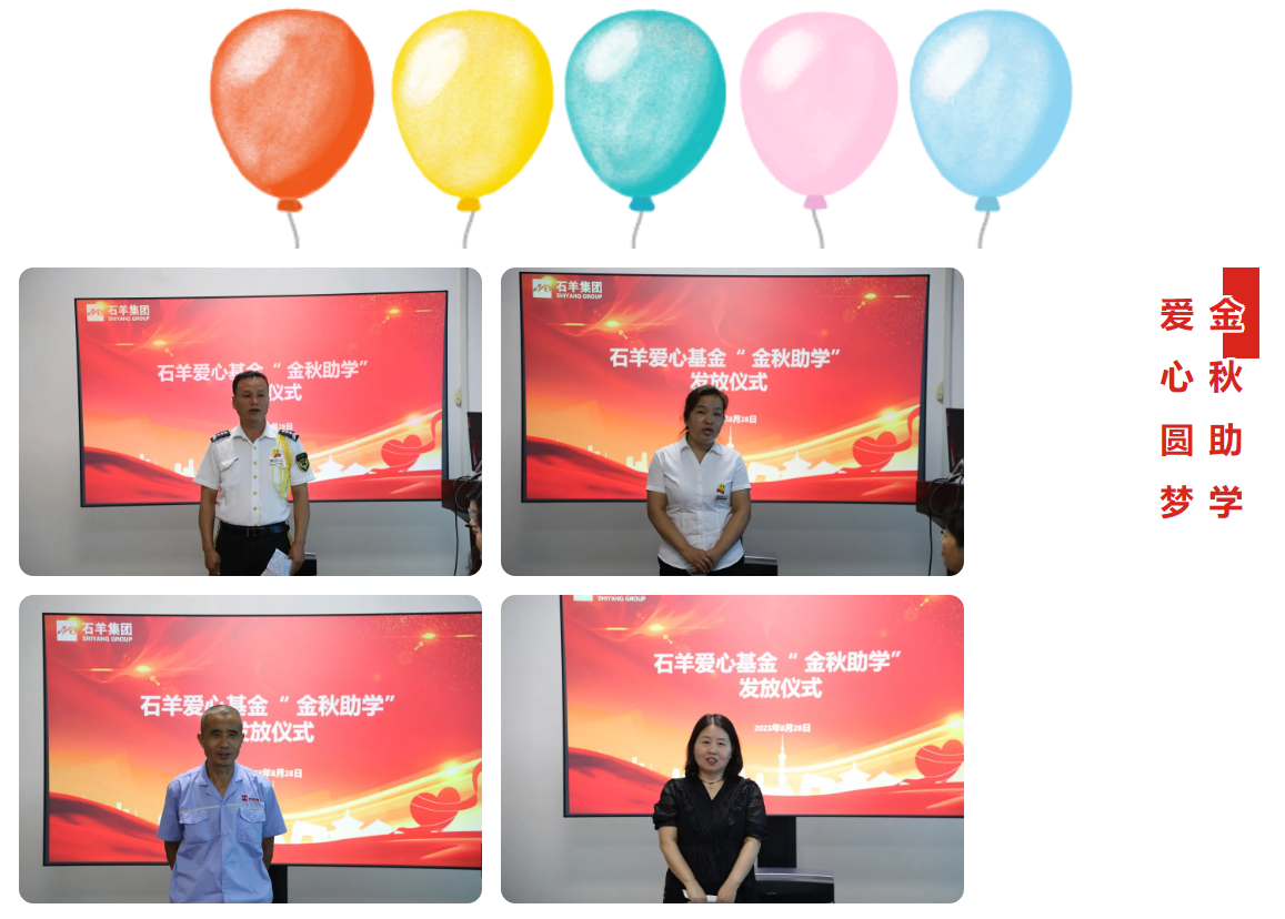 8月28日,一年一度的石羊集團(tuán)黨委愛(ài)心基金“金秋助學(xué) 愛(ài)心圓夢(mèng)”活動(dòng)在西安邦淇工廠(chǎng)如期舉行。本年度共為23名困難員工子女及上下游困難客戶(hù)子女發(fā)放9.5萬(wàn)元愛(ài)心助學(xué)金,助力學(xué)子圓夢(mèng)大學(xué)。